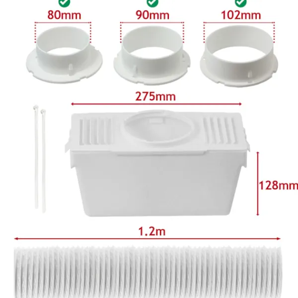 Satsen innehåller: 1 x ventilationsslang (1,2 m) — 1 x behållare/låda (med lock) — 2 x buntband — 3 x adaptrar (80 mm, 90 mm, 102 mm)