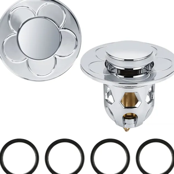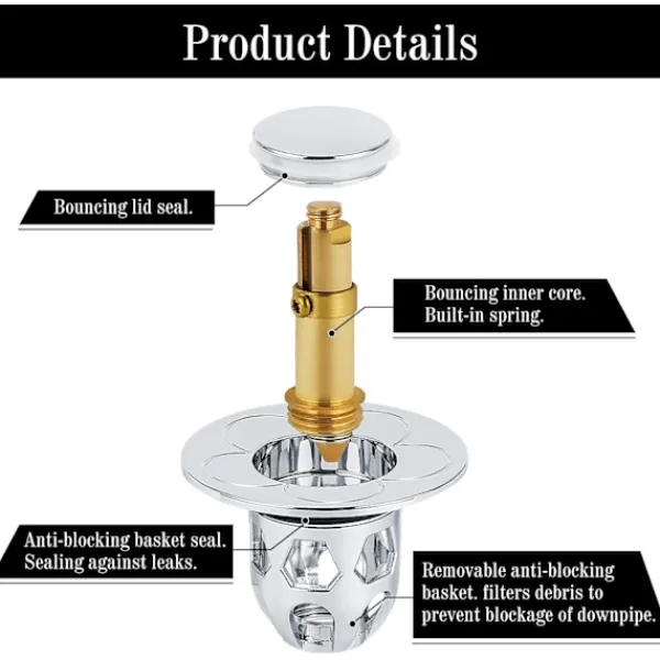 Pop-up avloppsventiler: till skillnad från avloppsskruvar med knapp – Traditionell tryckknapp, förbättrade tryckknappsborrar kan växla mellan lagrings- och tömningslägen genom att helt enkelt trycka på det övre locket och växlar inte när du trycker på knappen. En bra lösning på problemet med traditionella diskbänksfilter som läcker på grund av en felaktig knapp.