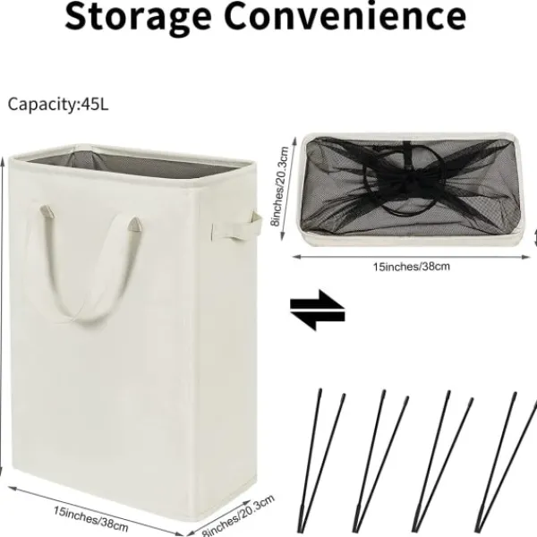 [Förstärkta handtag] De två förstärkta handtagen på sidan är utformade för att enkelt transportera tvättkorgen till sovrummet, badrummet eller tvättstugan. Handtaget är långt för att bära kläder med en hand. Denna tvättkorg med hjul är lätt att flytta runt. [Användarvänlig design] Perfekt för kompakt förvaring (38,1 x 20,8 cm), särskilt för sovsalar, hemlager eller resor. Mycket lätt, inget problem när du tömmer eller fyller den med kläder. Tvättkorgen ger en effektiv och platsbesparande lösning på dina tvättbehov. [Hållbart material] Vår lilla tvättkorg är tillverkad av Oxford-tyg. Den har inte bara god lastkapacitet, den är också hållbar. [Bekväm förvaring] Förvara denna produkt i en låda utan att ta upp för mycket plats, eller vik ihop den till en höjd av 1 tum (cirka 2,5 cm) utan att störa andra föremål. Denna Slimline tvättkorg är utformad för enkel förvaring och bekvämlighet.