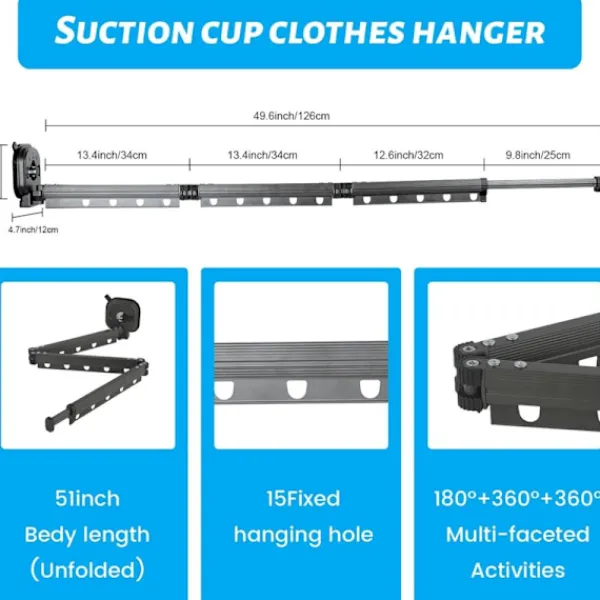【Kraftfull sugkopp】 Denna tvätttork är speciellt utformad med en stark sugkopp för att installeras, vilket gör den enkel att installera och avinstallera. Du behöver inte göra hål i väggen för att installera den. Stödet kan användas på släta väggar; interiört och exteriört.
