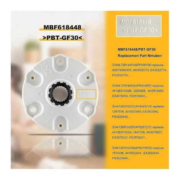 [MBF618448/PBT-GF30 kompatibla modeller: ]Brickrotornav F1355FDS5, WD12433BDA, WD12430RDG, WD12520BDM, WD12526BDM, WD13513BDA, 0WM0620H,0WMC, 0WM0620H, 0WMC HW, WM2487HWMA, WM2496HWM, WM2501HVA, WM2677HWM, WM2688HNMA, WM2701HV, WM2801HLA, WM2901HVA och mer Kompatibel för LG tvättmaskin[TIPS: ] Denna brickrotornav är modellnummer produkt kompatibel för LG tvätt Innan du köper produkten, se din reparationsmanual för att beställa rätt och kompatibla delar.[PAKET: ] Mitten av brickrotornavet är gjord av metall och resten är gjord av plast (PBT-GF30).