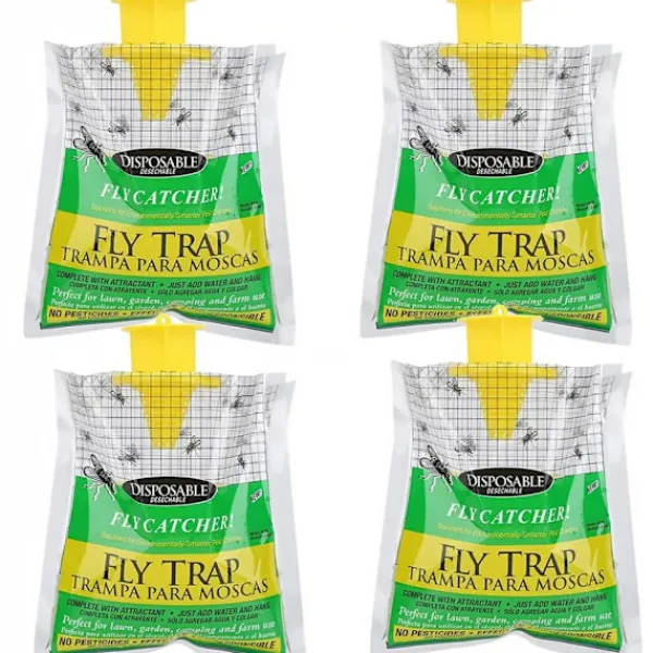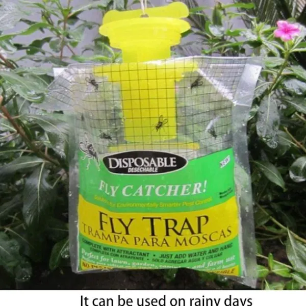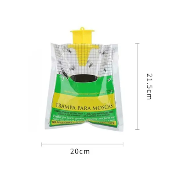 Flugfällor, som läggs i en dragpåse som flyger inte kan motstå. Betepåsen innehåller bete framkallat från något foder etc. När engångsflugpåsen är fylld med vatten börjar betet lösas upp, reagera och förånga en lukt som flugorna flyger in genom det gula locket och drunknar i vattnet.