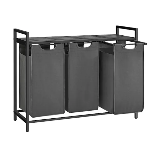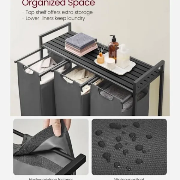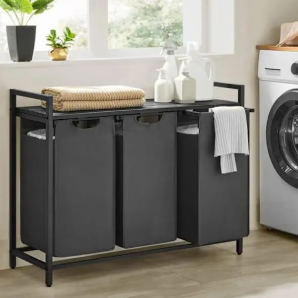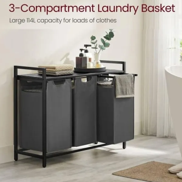 Skapa ordning bland tvätten med denna funktionella tvättkorg med tre fack och hylla – perfekt för hushåll där sortering är nyckeln till en smidigare vardag. Med en total kapacitet på 114 liter (38 liter per fack) får du gott om utrymme att separera kläder efter färg, material eller tvättprogram.
