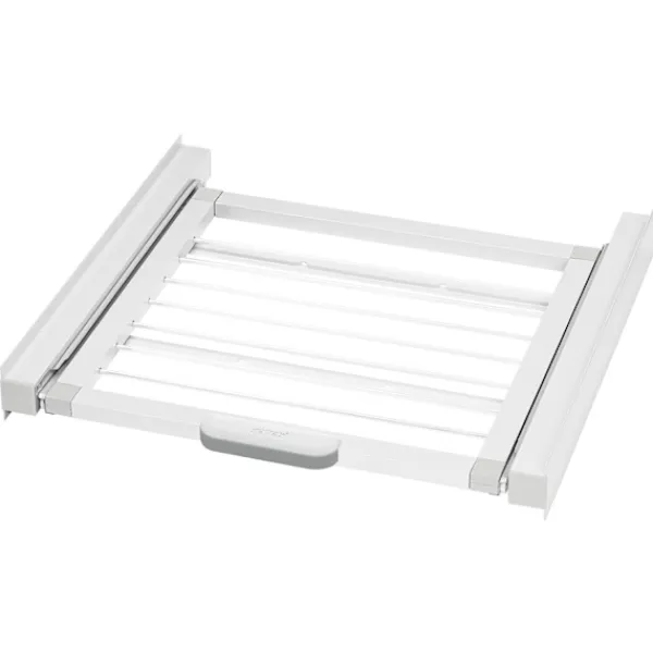 Den här staplingssatsen är utformad för att säkert fästa torktumlaren vid tvättmaskinen, vilket ger en stabil och effektiv tvättuppställning. Den är universellt kompatibel med de flesta tvättmaskiner och torktumlare som har en arbetsyta på 60 x 60 cm. Den integrerade utdragbara tvättställningen erbjuder ett bekvämt utrymme för att hänga upp mindre föremål eller förvara en tvättkorg och klarar en maximal belastning på upp till 10 kg.