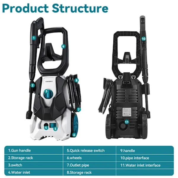 【Förvaringsdesign】Integrerad förvaring (inbyggt förvaringsställ för munstycke/vattenledning/tillbehör) + hjul för enkel förflyttning och förvaring.