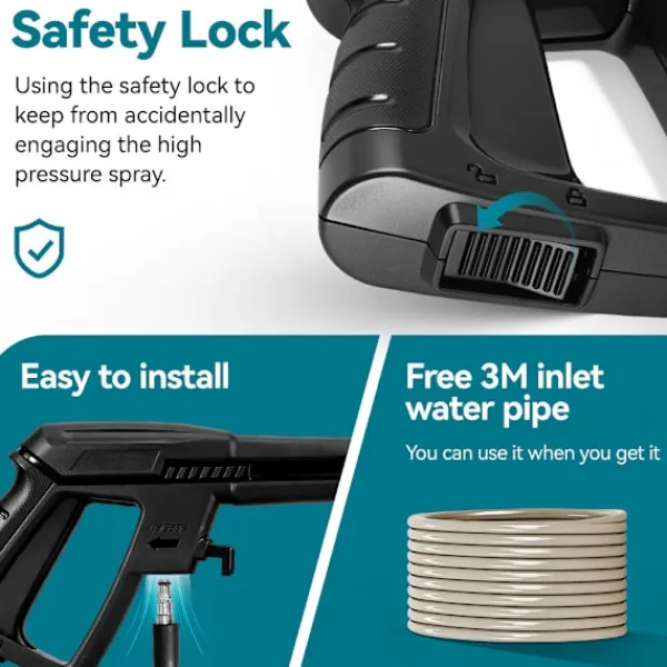 【Säkerhetsdesign】Explosionssäker vattenledning (PVC yttre lager + explosionssäkert nät), sprickbeständig under alla årstider; säkerhetslås + ergonomiskt handtag för att förhindra oavsiktlig aktivering och säkerställa bekvämt grepp under långvarig användning.