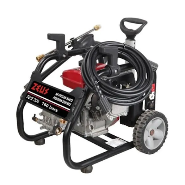 Högtryckstvätt med förbränningsmotor levererad med rotabuse som ger ett tryck på 160 bar – maximalt tryck med rotabuse: 160 bar – maximalt tryck utan rotabuse: 124 bar – Kontinuerligt tryck med rotabuse: 120 bar – Kontinuerligt tryck utan rotabuse: 90 bar – Maximalt flöde hastighet 450 l / h-7,5 L / min – Axial aluminiumpump – Kolvar av rostfritt stål – Typ av 4-taktsmotor Luftkyld – Bränsle: Bensin SP95 / 98 – Motoreffekt