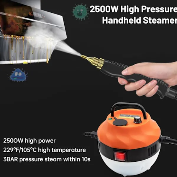 ?【2500W Handhållen Ångrengörare】2500W hög effekt kan generera 229°F/105°C hög temperatur och 3BAR tryckånga inom 10 sekunder, Denna höga temperatur säkerställer noggrann rengöring, effektivt avlägsnar envis fet smuts och fläckar.