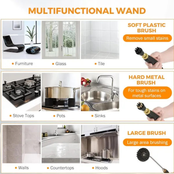 HÖG TEMPERATUR & HÖGTRYCKS RENGÖRING ÅNGA – elektrisk handhållen ångrengörare har en effekt på 2500W för att generera ånga upp till 105℃/221℉ på 15 sekunder, kan rengöra djupt och eliminera fett, smuts, damm och fläckar från en mängd olika ytor.