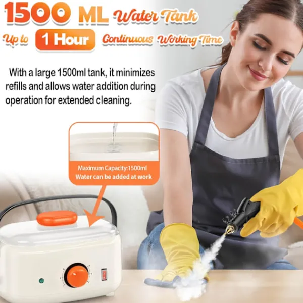 ??【1500ML Vattentank】 Denna ångrengörare för rengöring är utrustad med en 1500 ml vattentank, kan användas kontinuerligt i 30-70 minuter utan att behöva fyllas på ofta. Ångrengöraren har ett synligt plastskydd, vilket möjliggör en längre rengöringstid, är enklare