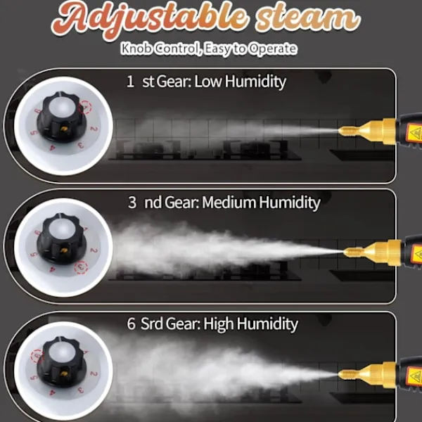 ?? 【6-nivåers justerbar ratt】 Den handhållna ångrengöraren har en 6-nivåers justerbar ratt, du kan justera ångan för att kontrollera ångintensiteten för att möta dina olika dagliga rengöringsbehov. Samtidigt släpper denna handhållna ångrengörare ut cirka 3 bar