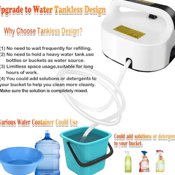 ??【Uppgradera till vattenlös design】 Du behöver inte fylla på vatten ofta, börja rengöra när som helst, var som helst. Den bärbara ångrengöraren med 106 cm klar slang kan anslutas direkt till en vattenbehållare för drift och kontinuerlig uppvärmning.