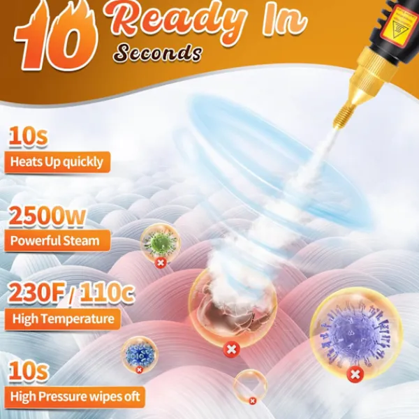 ??【2500W Hög temperatur & tryckångrengörare】 Ångrengörarens arbetseffekt är 2500W, den värms upp snabbt inom 15 sekunder och når 221°F/105°C, vilket är superkraftfullt och enkelt och grundligt kan lossa och lösa upp smuts, skära