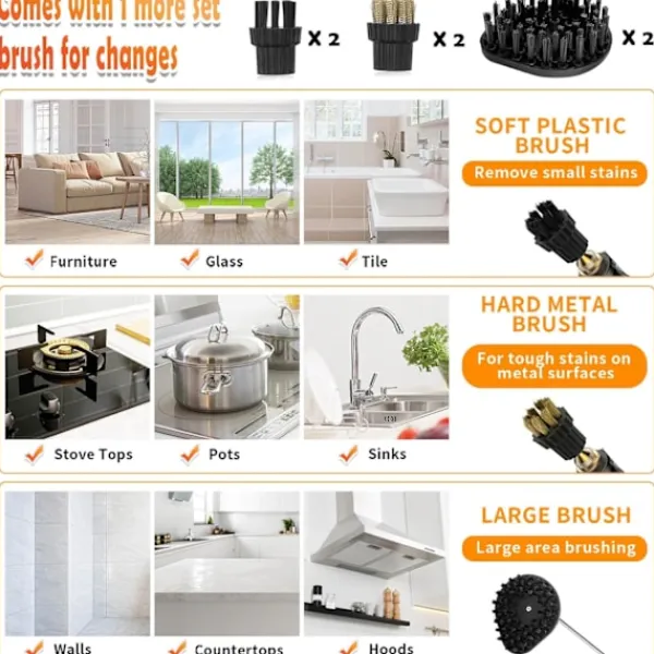 olika borsthuvuden kan högtrycksångaren inte bara användas för att rengöra köket, rengöra väggen, spisen, röken, mikrovågsugnen, tvättmaskinen, kylskåpet, bilen och mattan, utan kan också användas i stor utsträckning i kök, badrum, möbler, bil och