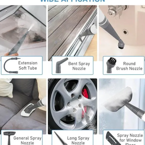 och 2 gummitätningar. Den är allsidig och kan rengöra alla svåråtkomliga springor, hörn, vinklar och även olika ytor/material: diskho, bänkskiva, grill, toalett, golv, barns leksak, husdjursmadrass, bil, soffa och kläder.