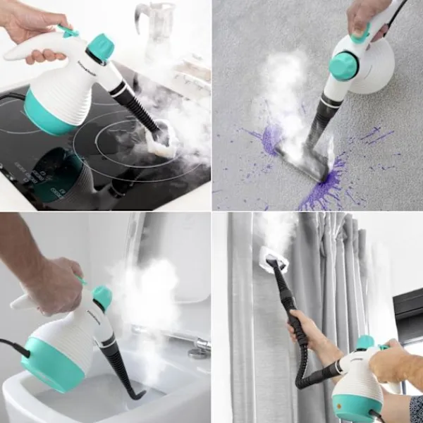 En handhållen ångtvätt med flera användningsområden som inkluderar nio tillbehör för en enkel och komplett rengöring på djupet. Ångtvätten rengör och desinficerar med trycksatt het ånga, är helt fri från kemiska produkter och avlägsnar effektivt fett, mögel och fläckar. Den möjliggör rengöring av hårda ytor såsom kakel, golv, handfat, bänkskivor, dörrar och fönster samt mjuka ytor såsom mattor, sängar, madrasser, täcken och soffor. Den värms upp på endast 3-5 minuter och släpper ut ånga i 15 till 20 minuter.- Handhållen ångtvätt för rengöring- Desinficerar med het ånga- Lämplig till hårda och mjuka ytorSpecifikationer:Färg: Vit, blåMaterial: PlastMått: ca. 29 x 13 x 23 cmKapacitet: 35 clTyp av kontakt: ELängd, kabel: 2.8 mTrycksatt ånga: 3 BARStröm: 1000 WFrekvens: 50-60 HzSpänning: 220-240 VFörpackningen Innehåller:1x Ångtvätt1x Långt munstycke1x Munstycke för fint flöde1x Munstycke för stora ytor1x Tillbehör för stort munstycke1x Runt borstmunstycke1x Flexibel förlängningsslang1x Trasa1x Tratt1x Mätbehållare1x Användarmanual