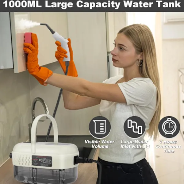 1000ml Vattentank: Denna hushållsrengörare kan ge dig tillräckligt med ånga för att säkerställa att dina rengöringsuppgifter utförs utan avbrott, med en arbetstid på upp till 30-60 minuter.