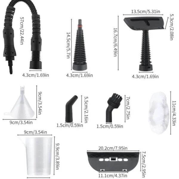 【Bredare Rengöringsområde】Denna kakelångrengörare levereras med en 9-delars tillbehörssats, vilket maximerar dess mångsidighet. Förlängningsslangen gör rengöring av trånga utrymmen och möbelytor enkel och bekväm, medan kakelfogborsten effektivt tar bort smuts och fett från kakelfogar. Fönsterrengöringsverktyg säkerställer att både inomhus- och utomhusglas är kristallklara, medan specialiserade borsthuvuden och raka munstycken gör exakt rengöring enkel och bekväm.