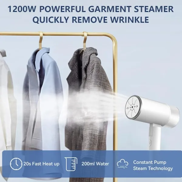 【20s Snabb uppvärmning】 Den handhållna ångaren fylls helt enkelt med kranvatten för att värmas upp på bara 20 sekunder med ett 1200W ultrasnabbt värmeelement. Så mindre väntan, mer tid att njuta av livet. Och den unika munstycksdesignen fördelar ångan kraftfullt och jämnt. Ångaren ger kontinuerlig, kraftfull och supertorr ånga för snabb strykning.