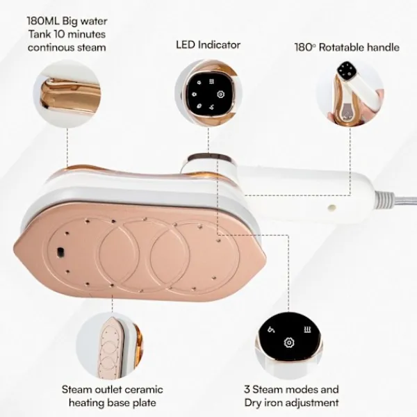 180° Roterbart handtag – Innovativt 180-graders justerbart handtag ger ultimat flexibilitet och komfort. Nå enkelt kragar, manschetter och sömmar samtidigt som du minskar trötthet i handleden, vilket gör långa strykningssessioner mer hanterbara och ergonomiska.
