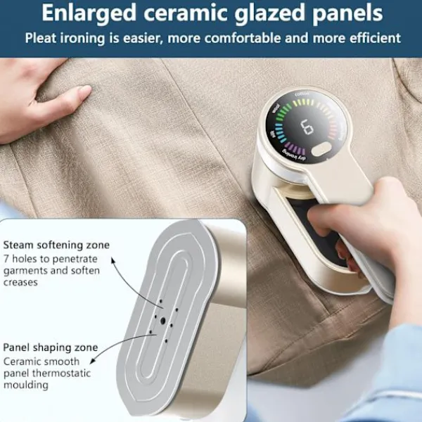 【KRAFTFULLA FUNKTIONER】 Kraftfullt ångstrykjärn, 9 sekunders snabb uppvärmning, uppgraderad keramisk glaserad stor panel, överdimensionerad panel med 7 små hål, snabb värmeledning, hög strykeffektivitet, förbättrar strykeffektiviteten avsevärt, ånga (ca 25 g/min) omedelbar frigörelse, direkt till rynkdelarna, fullständigt avdunstad utan att fläcka, så att kläderna är släta och jämna.