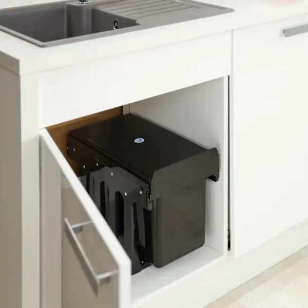 Dold sopsortering förvandlar ditt kök till en skräpfri zon, som sömlöst integreras under diskbänken för effektiv avfallshantering. Detta system förenklar sorteringen med lättåtkomliga glidskenor.