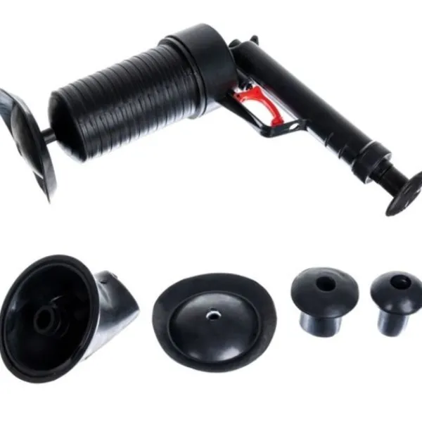 Tack vare denna unika enhet kommer du att glömma problemen med igensatta rör eller avlopp en gång för alla. Den trycksatta rörblockeraren är ett tillbehör som gör att du kan rensa alla igensatta platser i ditt hem med hjälp av luft. Satsen innehåller en pistol tillverkad av högkvalitativ plast och så många som 4 munstycken i olika former som passar till avloppet i toaletten, tvättstället, handfatet, duschkabinen eller badkaret. Du behöver inte bry dig om vanliga kolvar som är fulla av bakterier och miljöskadliga kaustiska rengöringsmedel.