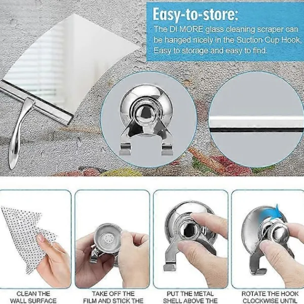 Glasrengöringsskrapan levereras med självhäftande krokar. Användarna kan enkelt hänga upp glasskrapan och glaset, vilket sparar utrymme för användarna.