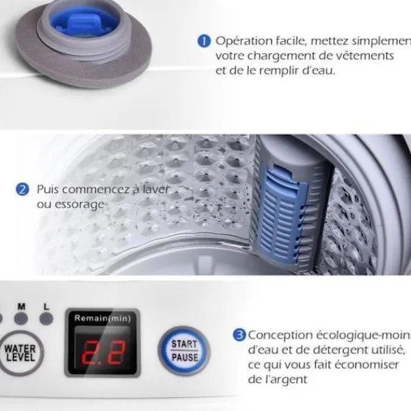 Tvätteffekt 240 W, centrifugeringseffekt 210 W Encylindrig tvättmaskin med två funktioner – tvättning och uttorkning 6 tvättcykler Tvättmaskinstomme i PP och motor i aluminium Hög soliditet och hållbarhet vid användning. Idealisk tvätt maskin för hyresgäster, kontorsanställda??Energi- och vattenbesparing??Lätt att använda även för äldre eller barn