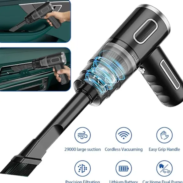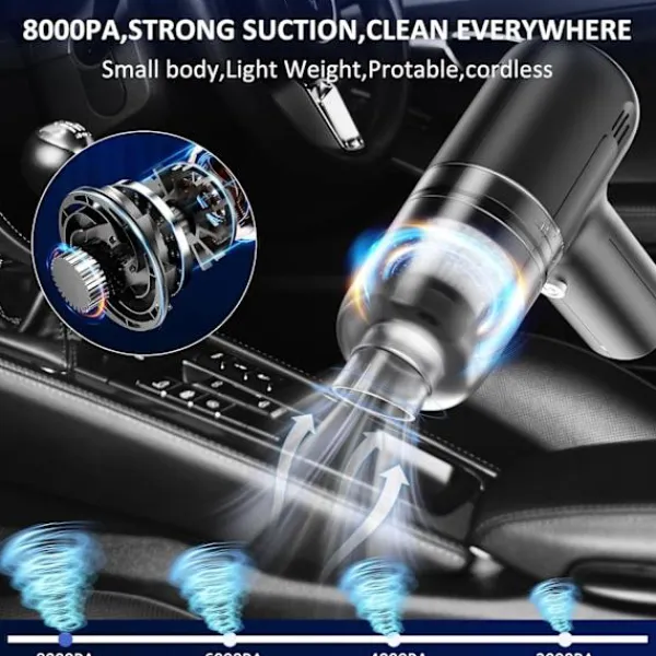Med ett kraftfullt 29 000PA sug uppnår denna laddningsbara bildammsugare snabb rengöring och tar enkelt bort djurhår, damm, skräp och mer. Supermotorn ger starkt sug för effektiv rengöring. Den sladdlösa och bärbara designen gör denna minidammsugare otroligt bekväm att använda, vilket säkerställer att din hand aldrig känns trött när du hanterar mattor, soffor eller bilinteriörer. Den kan absorbera dolda skräp på tangentbord, såsom smulor, matrester, pappersrester, damm, gummiskrot och små partiklar. USB-driven, denna tangentbordsdammsugare ansluts direkt till en USB-port, vilket gör den bärbar och lämplig för datorer, stationära datorer och PC.