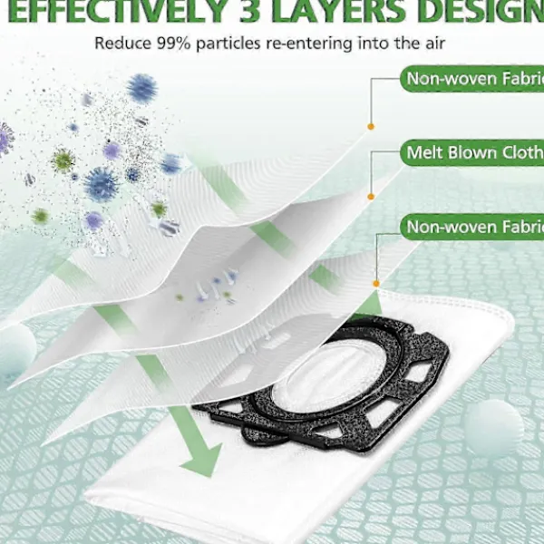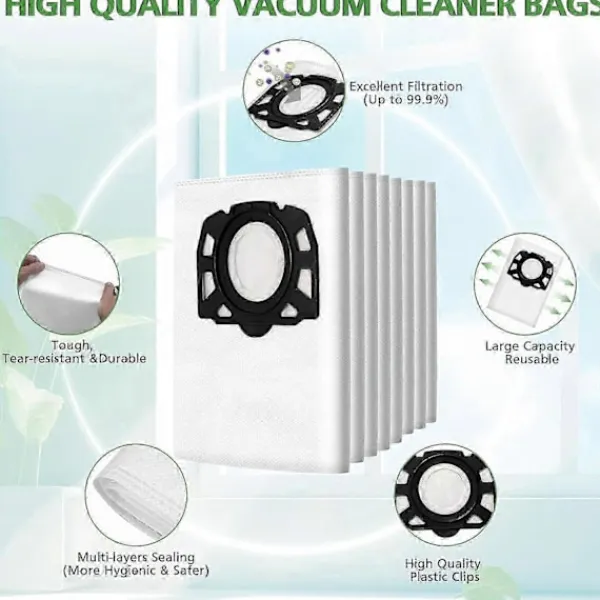 Utmärkt filtreringsprestanda: KFI 357 dammsugarpåsar för Kärcher har 3-stegs filterfunktion, tillverkade av 2 lager non-woven tyg och 1 lager fint smältblåst fiberfilterlager, kan effektivt filtrera 99,97% av smuts och dammpartiklar och allergener upp till 2,5 m och skapa en hälsosam livsmiljö för dig!