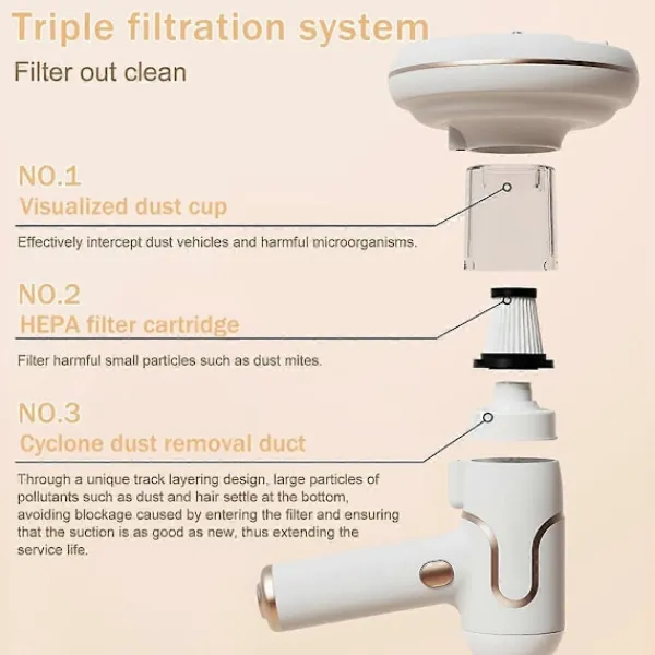 Mångsidig 3-i-1-funktionalitet: Fungerar som en dammsugare mot kvalster, allmän dammsugare och dammblåsare, vilket ger omfattande rengöringslösningar. Dess trådlösa, kompakta design säkerställer rörelsefrihet och enkel användning i olika utrymmen, inklusive hem och fordon.