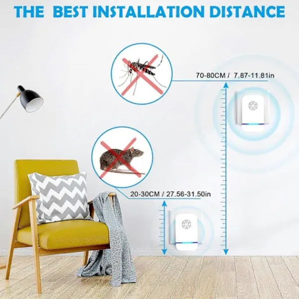 Lätt att använda Ultraljudsinsektsavvisaren är mycket enkel att använda, du behöver bara hålla avvisaren vinkelrätt mot marken, sedan koppla in den i uttaget och den fungerar automatiskt. När det blå ljuset lyser betyder det att produkten börjar fungera. (Vi rekommenderar att du installerar ultraljudsavvisaren 20-80 cm från marken.)