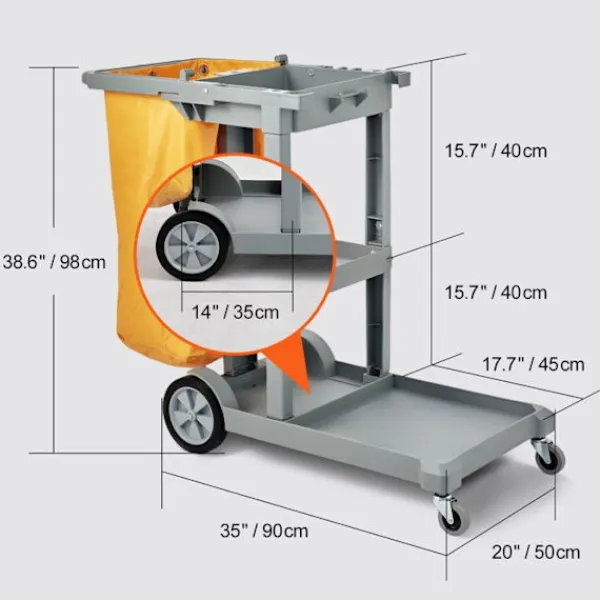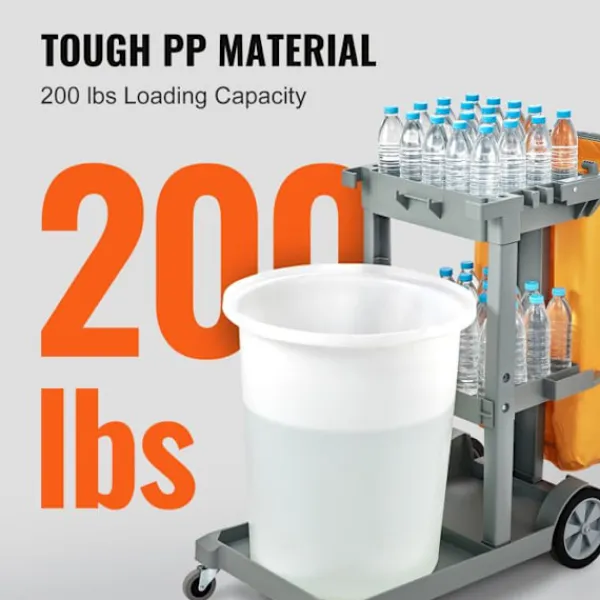 Produktdimensioner (B x D x H): 120 × 51 × 98 cm (47″ x 20″ x 38,6″)>Artikelns vikt: 12,2 kg (27 lb)>Kapacitet: 90,7 kg (200 lb)>Material för vagn: PP>Volym av soppåse: 94,6 L (25 gallons)>Material av påse: PVC>Typ: Rengöringsvagn med 3 hyllor