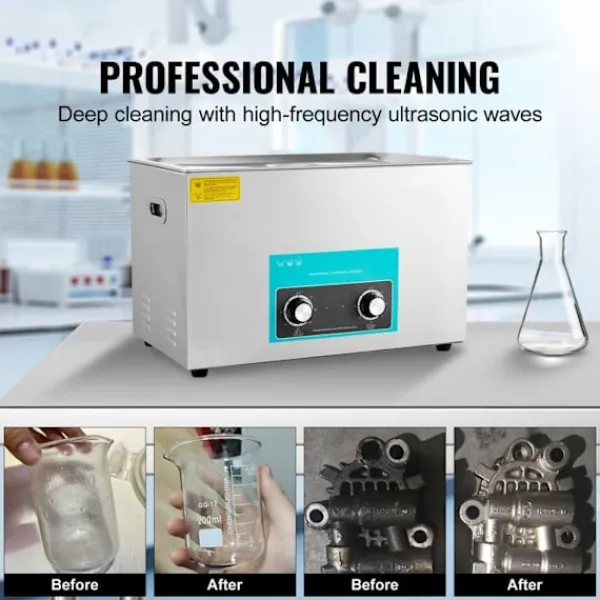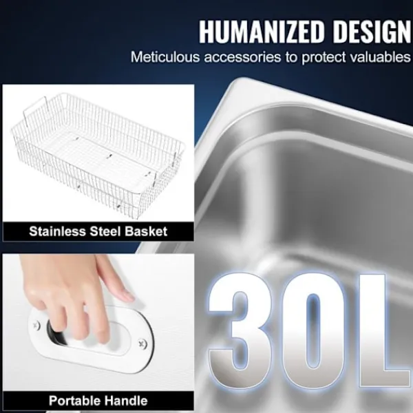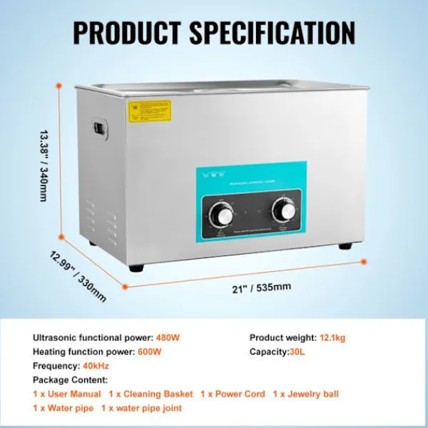 Ultraljudsfrekvens: 40 KHz > Tankkapacitet: 30L > Rengöringskraft: 600 W > Arbetstid: 0-30 minuter > Material: rostfritt stål > Produktens vikt: 33,4 lb / 15,2 kg > Förpackningsdimensioner (L x B x H): 63 x 46 x 41 cm / 24,9 x 18 x 16,1 tum > Tankdimensioner: 51 x 31 x 21 cm / 20 x 12 x 8 tum > Produktens dimensioner (L x B x H): 58,4 x 33 x 33 cm / 23 x 13 x 13 tum > Värmefunktion: 500 W (effekt) > Uppvärmningstemperatur 0-80 ℃