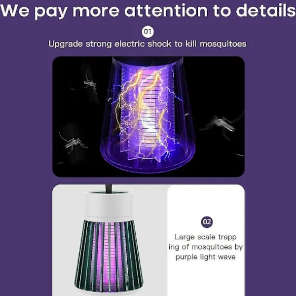 Den elektroniska myggdödarlampan är en bärbar och uppladdningsbar enhet som effektivt eliminerar skadedjur och flugor. Den avger ett lila ljus för att locka till sig insekter och har en elektrisk chockfunktion för att eliminera dem. Denna insektlampa är säker att använda och skadar inte människor, vilket gör den lämplig för familjer med spädbarn eller gravida kvinnor. Dessutom har den en låg ljudnivå, vilket säkerställer att den inte stör dig eller andra. Du kan placera den i olika rum som sovrum, barnrum och vardagsrum. Med sin 365nm våglängd och 360 graders belysningsdesign är denna insektlampa kraftfull och effektiv.