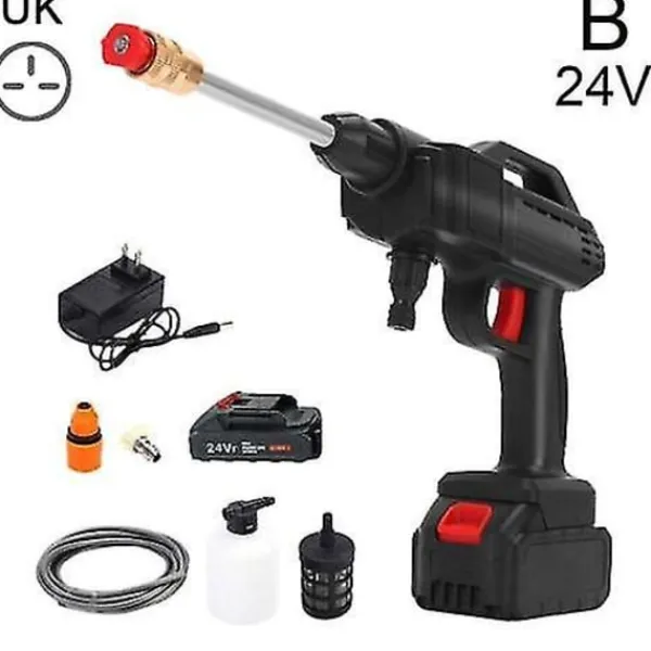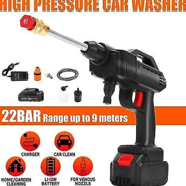 Batteridriven sladdlös högtryckstvätt, uppladdningsbar högtryckstvätt för bilar *1. Färg: Svart *2. Material: ABS och koppar *3. Spänning: 21V *4. Motor: ren kopparinduktionsmotor *5. Vattentryck: 0.9mpa *6. Produkttryck: 22 bar *7. Vattenflöde: 200L/h *8. Räckvidd: 8-10m *9. Transmissionseffekt: 10kw *10. Vattenslangens längd: 5m Funktioner: *1. Sladdlös högtryckstvätt tar hänsyn till portabilitet och bekvämlighet, det finns ingen strömkabel längre, högkapacitets batteridriven, vilket gör att du kan rengöra alla dina utomhusutrymmen och redskap, när som helst, var som helst. *2. Levereras med 2 utbytbara munstycken som levererar 2 sprutmönster för att skölja bort envisa fläckar eller för att täcka ett brett område för att blöta ner karossen eller bada husdjuren. *3. Självsugande design sparar dig från bekymmer om vattenförsörjning, du kan enkelt få vatten från vilken tank eller kran som helst, och filtret undviker igensättningsproblem. *4. Med kompletta tillbehör för att få rengöringsjobbet gjort. *5. Kraftfull motor sätter tryck på vattenflödet till 22 bar, vilket enkelt tar bort den mest envisa leran och fläckarna från hushållsytor utomhus, grindar, bänkar, trädgårdsmöbler och utrustning, cyklar, motorcyklar, bilar, trappor och mer