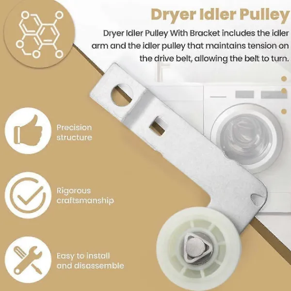W10547290 Torktumlare Spännrulle med Fäste inkluderar spännararmen och spännrullen som upprätthåller spänningen på remmen, vilket gör att remmen kan rotera. Koppla bort strömmen innan du installerar denna del. Använd arbetshandskar för att skydda dina händer.