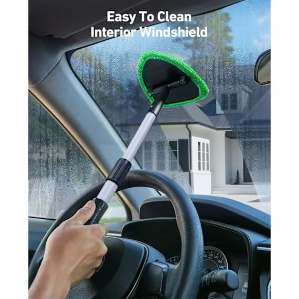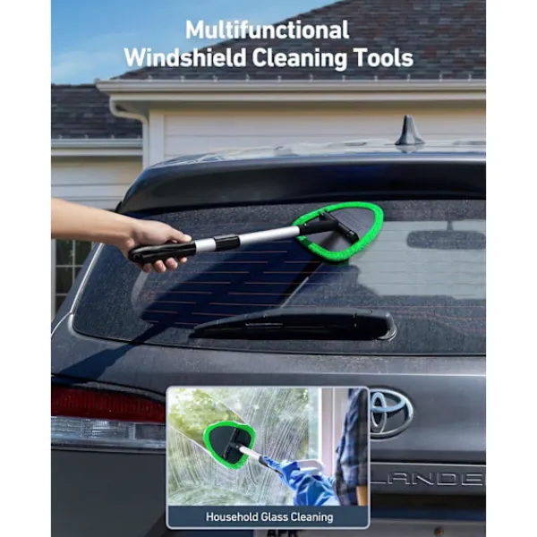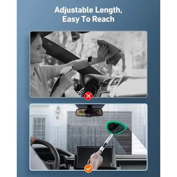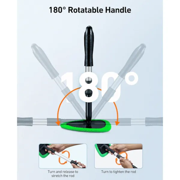 Specialist på invändigt glas: Den invändiga bilfönstertvätten har ett 180-graders roterande huvud för att komma åt svåråtkomliga områden bakom instrumentbrädor. Vindrutetvättverktyget kan förlängas från 40,4 cm till 53,3 cm. Du behöver inte längre skada ryggen när du rengör