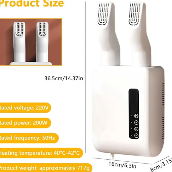 2—Kreativ Väggmonterad Design: Skotork Säg adjö till våta, obekväma skor! Upplev skillnaden med vår innovativa design, dessa torra munnar gräver djupt in i insidan av tån på din höga stövel. Det 360° roterbara luftutloppet rymmer skor och handskar i olika storlekar och former. Håll dina skor och stövlar torra och bekväma med denna innovativa och lättanvända torktumlare!