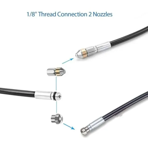 Rengör djupare än traditionella rörrensningar samt en professionell rörmokare. Den medföljande adaptern gör att du kan använda vår kombinationsrengöringsslang med en högtryckstvättspistol. Den flexibla slangen kan föras genom böjda och komplicerade rör, och munstycket avger en tryckvattenstråle för att rengöra och rensa röret. Satsen innehåller två munstycken: det sfäriska munstycket kan sprutas samtidigt framåt och bakåt för att avlägsna stora mängder hinder. Rotationsmunstycket rengör insidan av röret på djupet. Kompatibel med Kärcher K2K3K4K5K7 HD/HDS högtryckstvättar och högtryckspistoler.