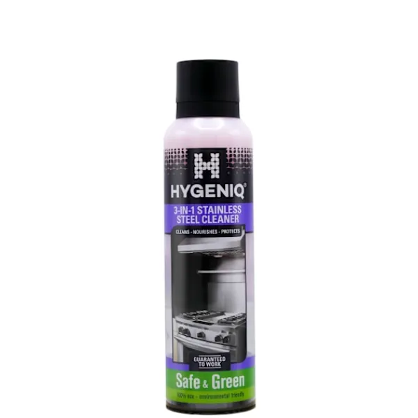 HYGENIQ 3-i-1 rengöring för rostfritt Stål innehåller inga skadliga eller giftiga kemikalier. Det är säkert och milt för huden, och avger inga skadliga ångor. Det tar enkelt bort fläckar från allt rostfritt stål, polerat krom och polerade aluminiumytor, och lämnar en skyddande, långvarig, smutsavvisande, djupt glänsande film. Ta bort envis smuts före användning. Spraya en lämplig mängd på ytan och gnugga med en ren torr trasa tills ett rent resultat och en djup glans skapas. Behandlingen kan upprepas om ytan inte uppvisar en tillfredsställande effekt omedelbart.