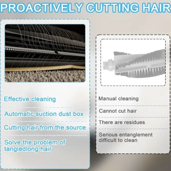 Förbättrad Hårklippning: TriCut-tekniken säkerställer effektiv klippning av trassligt hår, vilket avsevärt minskar behovet av manuell rengöring. Dess innovativa design gör att dammsugaren kan bibehålla optimal prestanda genom att förhindra att hår lindas runt borsten. Detta leder till en mer grundlig och konsekvent rengöringsupplevelse, vilket sparar tid och ansträngning. Den exakta klippningen säkerställer att även de finaste hårstrån avlägsnas effektivt, vilket lämnar dina golv fläckfria och fria från skräp. Regelbundet byte av borsten säkerställer att denna funktion fortsätter att vara effektiv.