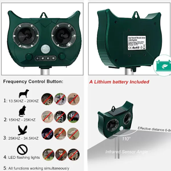 Skadedjurskrämman drivs av solceller men kan även laddas med den medföljande Micro-USB-kabeln. Ljudet på skrämman går att justera beroende på vilka sorts djur du hålla borta, då vissa är känsligare än andra. Kan justeras mellan 13.5-40 kHz.
