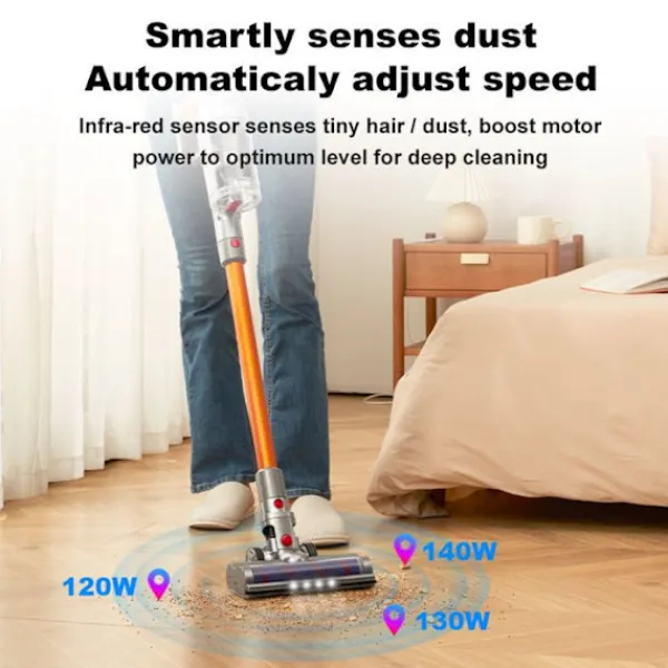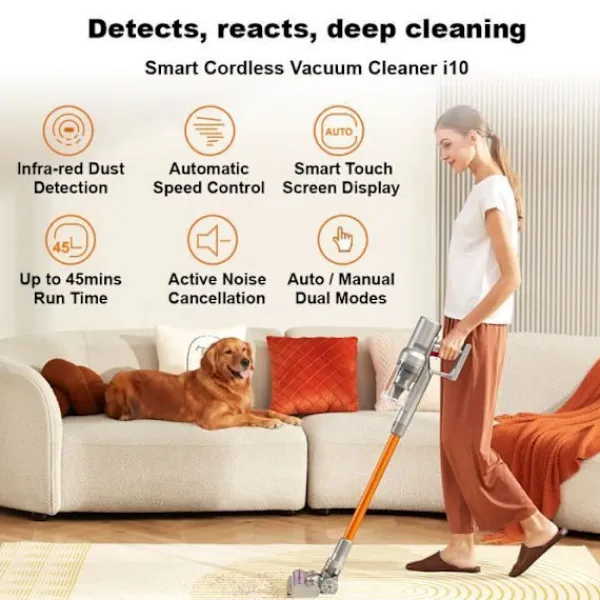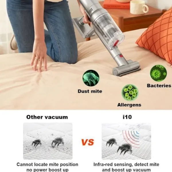 Liectroux i10:s trådlösa golvvakuum erbjuder en sugkraft på 27000Pa och har en integrerad LED-belysning. Med sin HEPA-filtrering och lätta design är den perfekt för att städa bilar och möbler. Njut av en driftstid på 40 minuter och en dammbehållare på 0,8 L för en effektiv och praktisk rengöring.