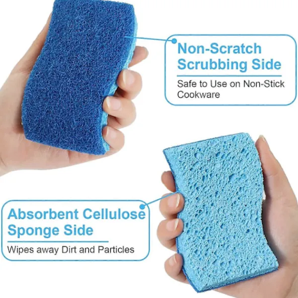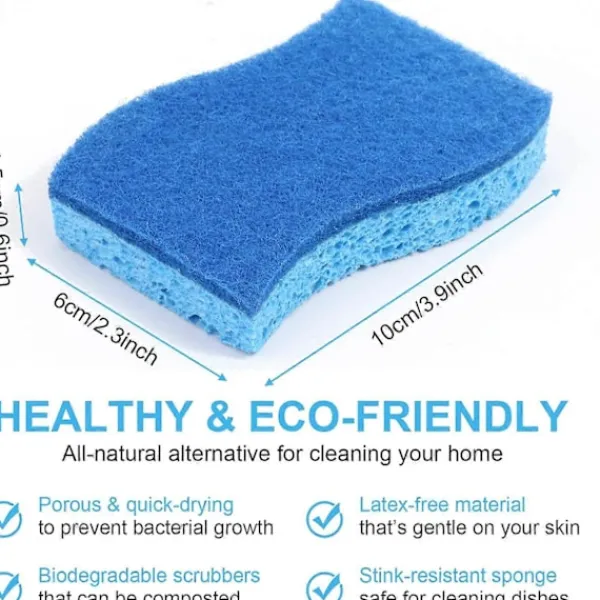 Hälsosamt rengöringslägeVår kökssvamp är gjord av ett kungsblått skurlager och ett ljusblått repfritt cellulosasvampslager. Till skillnad från sin plastmotsvarighet har vår disksvamp en porös struktur, vilket hjälper den att torka snabbt och minskar risken för att patogena föreningar förökar sig.