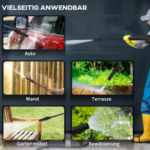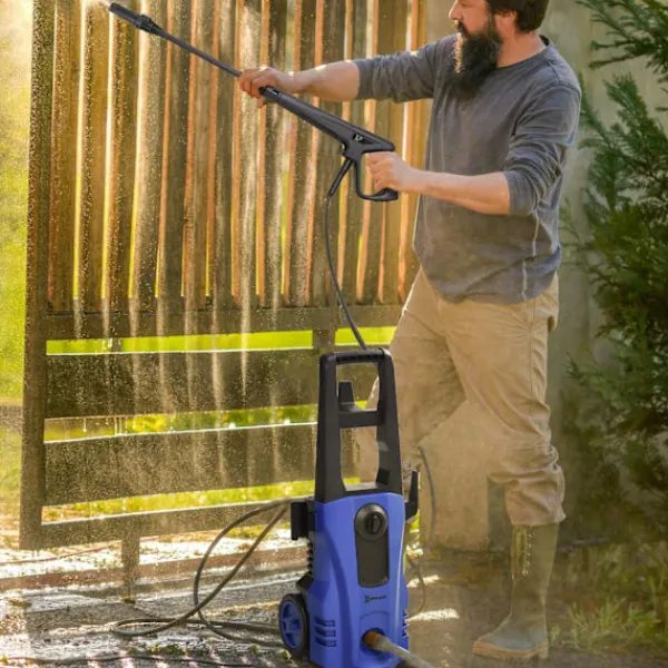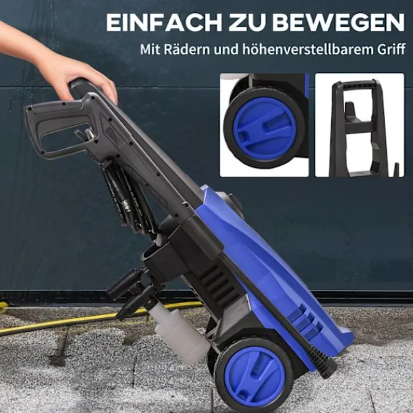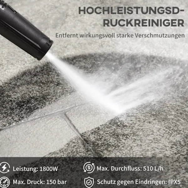 Huset ser gammalt ut från utsidan? Bilarna är fulla av lera och insekter? Ta då en titt på denna bärbara högtryckstvätt från. Rengöringen klarar många uppgifter med hög prestanda: med en 1800 watts motor, ett högt tryck på 150 bar och ett flöde på 510 liter per timme är det lätt att ta bort även envisa fläckar. Slangen är 6 meter lång, strömkabeln är 5 meter. Tack vare hjulen kan enheten enkelt flyttas runt i trädgården.