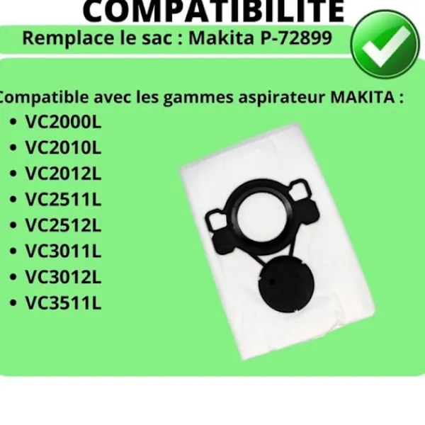 Detta paket med 10 dammsugarpåsar är kompatibelt med modellerna Makita VC2000L, VC2010L, VC2012L, VC2511L, VC2512L, VC3011L och VC3012L. Byt enkelt ut påsen med referens P-72899 för en effektiv rengöring.