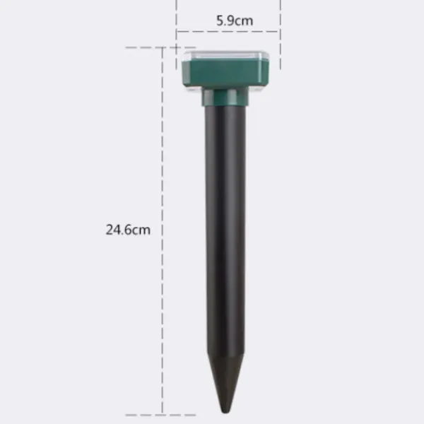 Solcellsdriven Skadedjursbekämpare för ormar, råttor och gnagare – 2 pack. Ett mycket miljövänligt och effektivt sätt att ta bort skadedjur som mullvadar, möss, råttor och ormar utan att använda fällor eller kemikalier. Laboratorietester har visat att ultraljudsvågor angriper hörsel- och nervsystemet hos de flesta skadedjur och på så sätt orsakar det smärta och obehag som skadedjuren avskyr och därmed lämnar området. Det ingår 2 st ultraljudsavskräckare som placeras i jorden.
