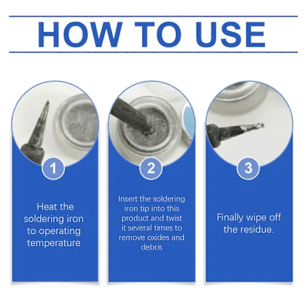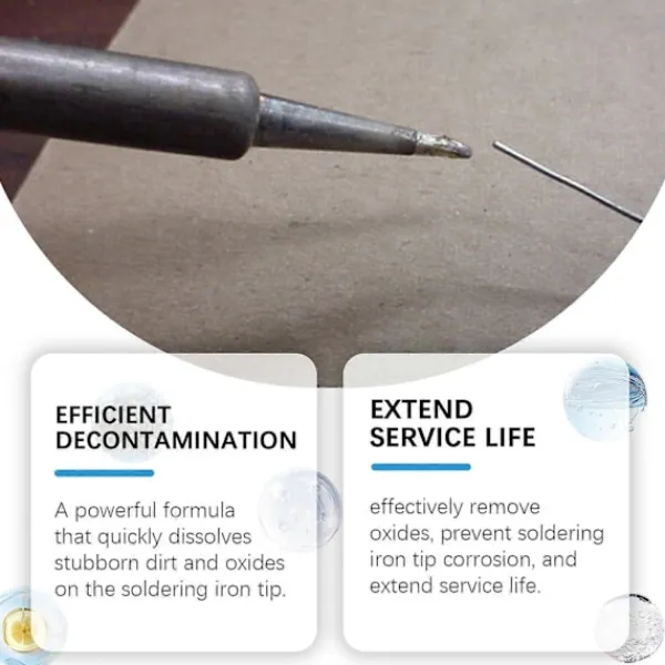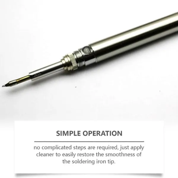 Vår rengörare för lödspetsar innehåller tennpulver och citronsyra. Den löser snabbt upp envis smuts och oxider från lödkolvens spets. Användningen är enkel: värm lödkolven till dess driftstemperatur, för in spetsen på kolven i produkten och vrid den flera gånger för att avlägsna oxider och skräp, och torka slutligen bort resterna. Och den kan ta bort smuts och oxider på en minut, vilket återställer lödkolvshuvudets prestanda.